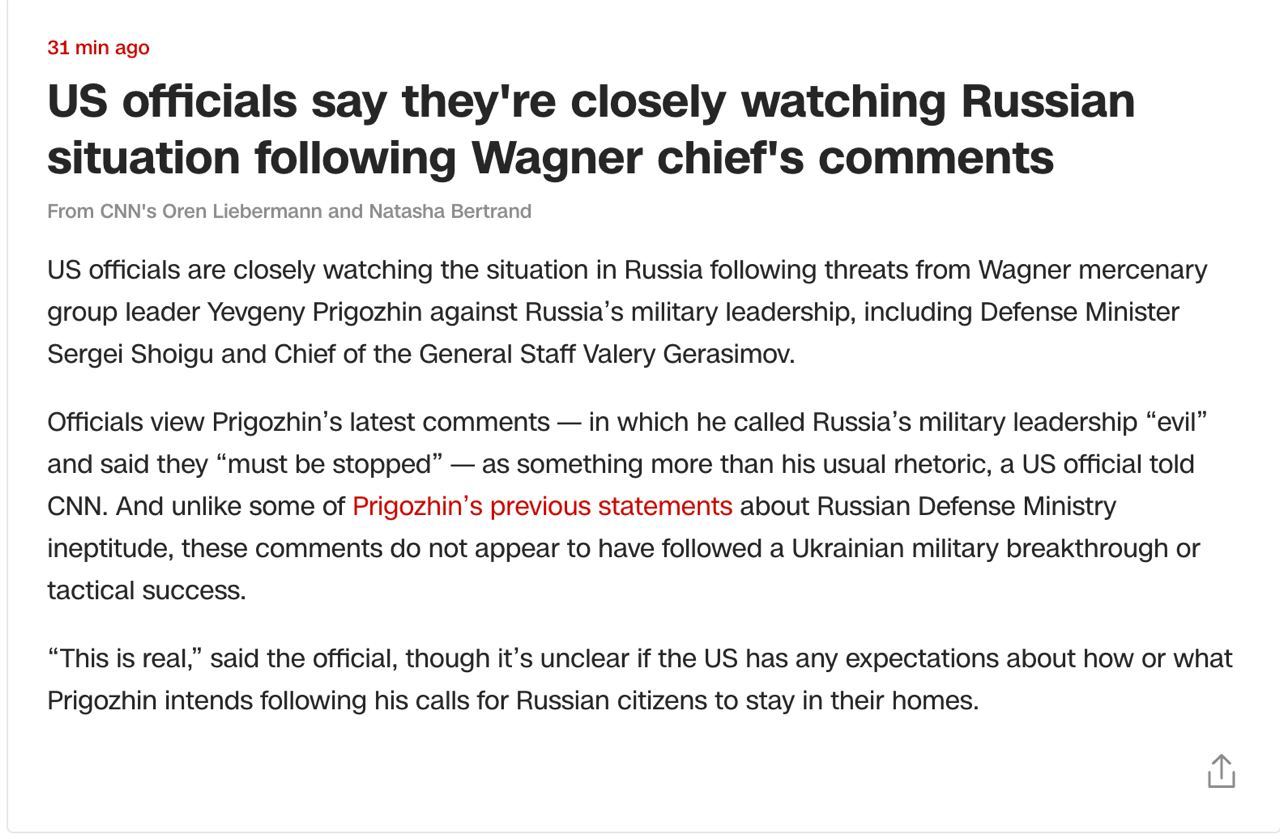 "Офіційні особи розглядають останні коментарі Пригожина, в яких він назвав російське військове керівництво "злом" і сказав, що їх "необхідно зупинити" - як щось більше, ніж його звичайна риторика", - говорить джерело телеканалу.