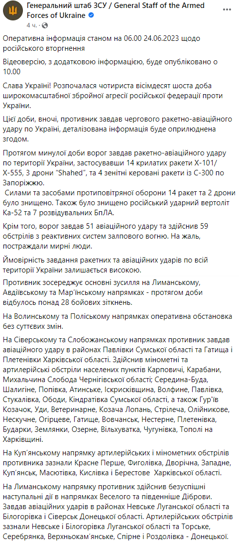 У суботу, 24 червня, Генштаб ЗСУ оприлюднив зведення про ситуацію на фронті.