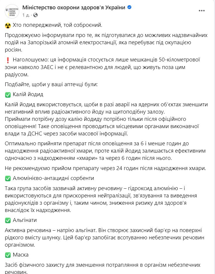Зазначається, що ця інформація стосується лише мешканців 50-кілометрової зони навколо ЗАЕС і не є релевантною для людей, які живуть поза цим радіусом.
