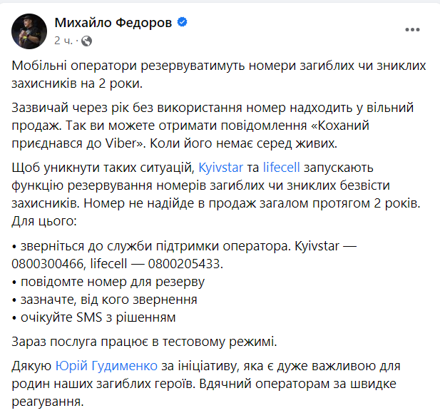 Щоб уникнути таких ситуацій, Kyivstar та lifecell запускають функцію резервування номерів загиблих або зниклих безвісти захисників. Загалом номер не надходитиме у продаж два роки.