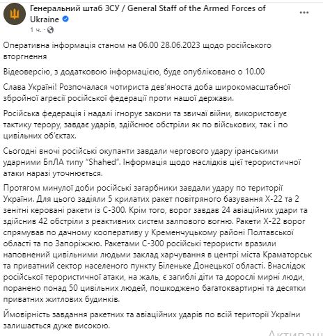 У середу, 28 червня, Генштаб ЗСУ оприлюднив зведення про ситуацію на фронті.