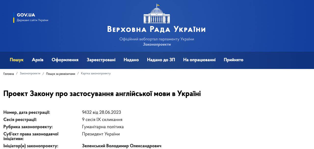 Президент України Володимир Зеленський вніс до Верховної Ради законопроект, який офіційно визначає статус англійської як однієї з мов міжнародного спілкування в Україні.