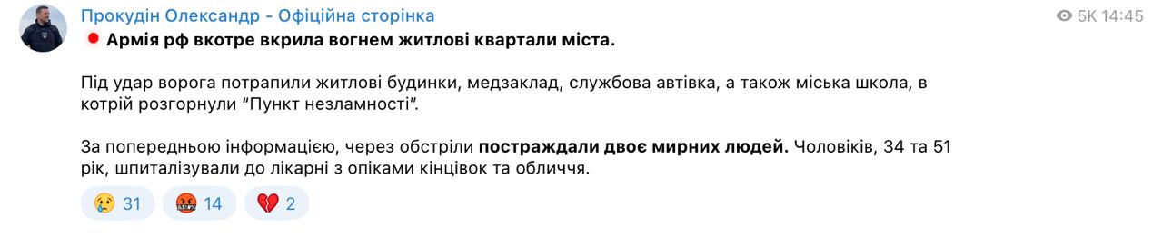Внаслідок обстрілу щонайменше дві людини загинули біля пункту незламності, одержуючи гуманітарну допомогу. Ще двоє людей поранено – це двоє чоловіків віком 31 та 51 роки. Вони перебувають у лікарні у стані середньої тяжкості.