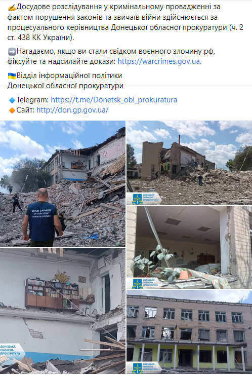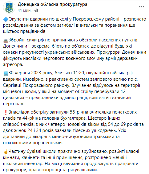 У селі Сергіївка Покровського району Донецької області двоє людей загиблих і шестеро було поранено внаслідок обстрілу школи.