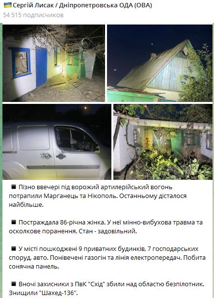 У Нікополі постраждала 86-річна жінка. У неї мінно-вибухова травма та осколкове поранення. Стан – задовільний.