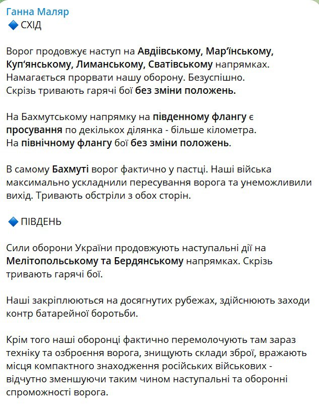 Маляр повідомила, що у самому Бахмуті росіяни знаходяться фактично у пастці. ЗСУ "максимально ускладнили" їхнє пересування і унеможливили вихід.