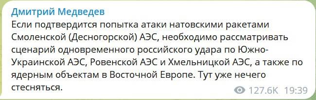Після цього Медведєв написав у своєму телеграм-каналі, що якщо підтвердиться "спроба атаки натівськими ракетами" Десногорської АЕС, необхідно розглядати сценарій одночасного російського удару по Південно-Українській АЕС, Рівненській АЕС та Хмельницькій АЕС, а також по ядерних об'єктах у Східній Європі.