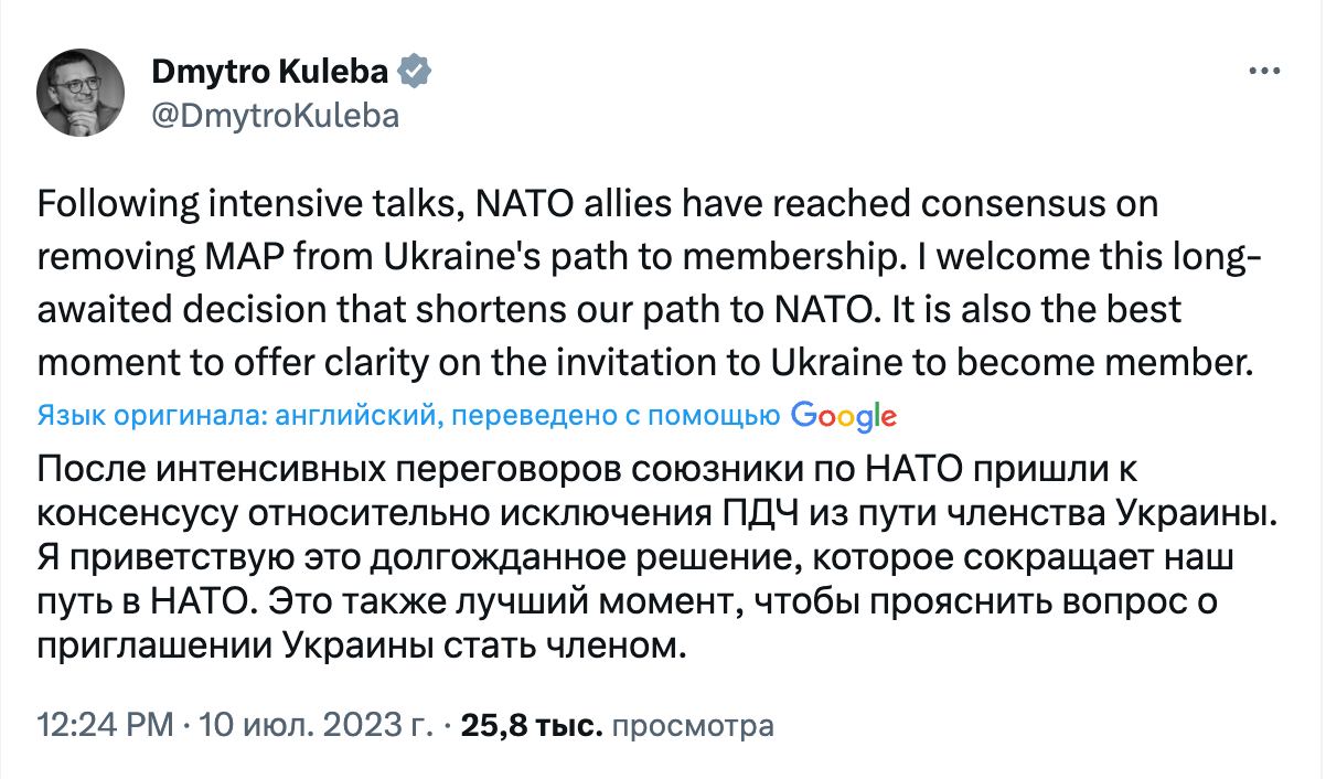"Після інтенсивних переговорів союзники з НАТО дійшли консенсусу щодо виключення ПДЧ із шляху членства України. Я вітаю це довгоочікуване рішення, яке скорочує наш шлях до НАТО. Це також найкращий момент, щоб прояснити питання про запрошення України стати членом", - написав Кулеба.