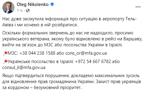 "Оскільки формальні звернення до нас не надходили, просимо українського ветерана, якому було відмовлено у рейсі на Варшаву, вийти на зв'язок у МЗС чи посольство України в Ізраїлі", - звернувся він до українського військового.