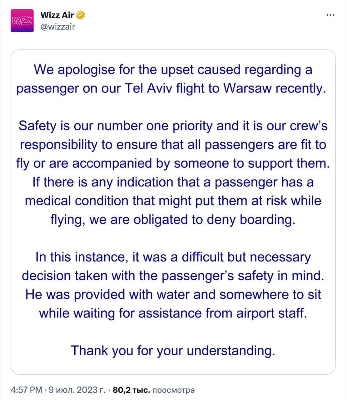 "Безпека - наш пріоритет номер один, і це турбота нашого екіпажу переконатися, що всі пасажири в змозі літати або супроводжуються кимось, хто їм допомагає. Якщо є якісь ознаки того, що стан здоров'я пасажира може наразити їх на ризик під час польоту, ми повинні відмовити у посадці.