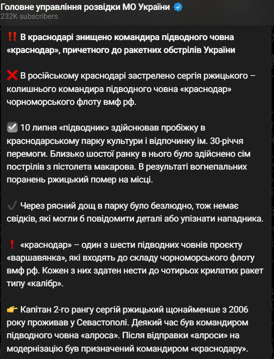 Раніше в РФ заявили, що основною версією вбивства стало замовлення українських спецслужб. ГУР Міноборони України опублікувало новину про вбивство Ржицького, не коментуючи інформацію про свою причетність до нього.