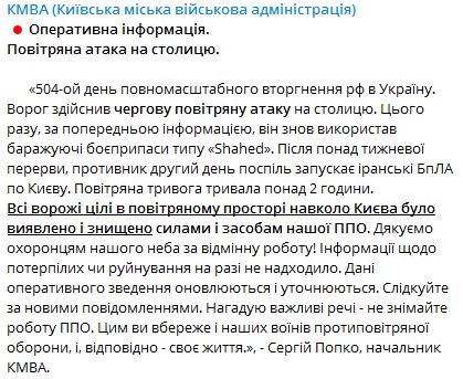 За попередньою інформацією, були використані дрони типу "Шахед". Це вже друга поспіль нічна атака на столицю.