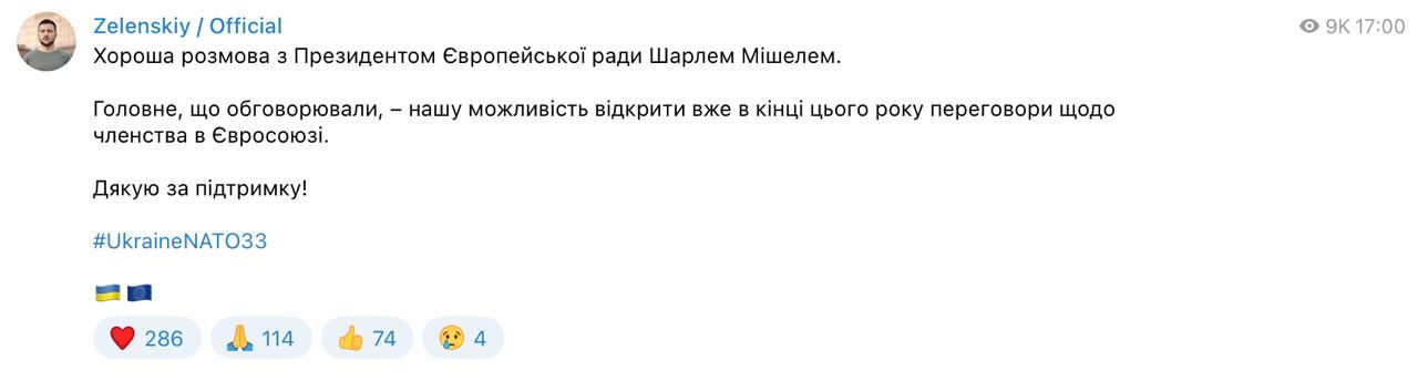 "Хороша розмова з президентом Європейської ради Шарлем Мішелем. Головне, що обговорювали – нашу можливість відкрити вже наприкінці цього року переговори щодо членства у Євросоюзі", - повідомив Зеленський.