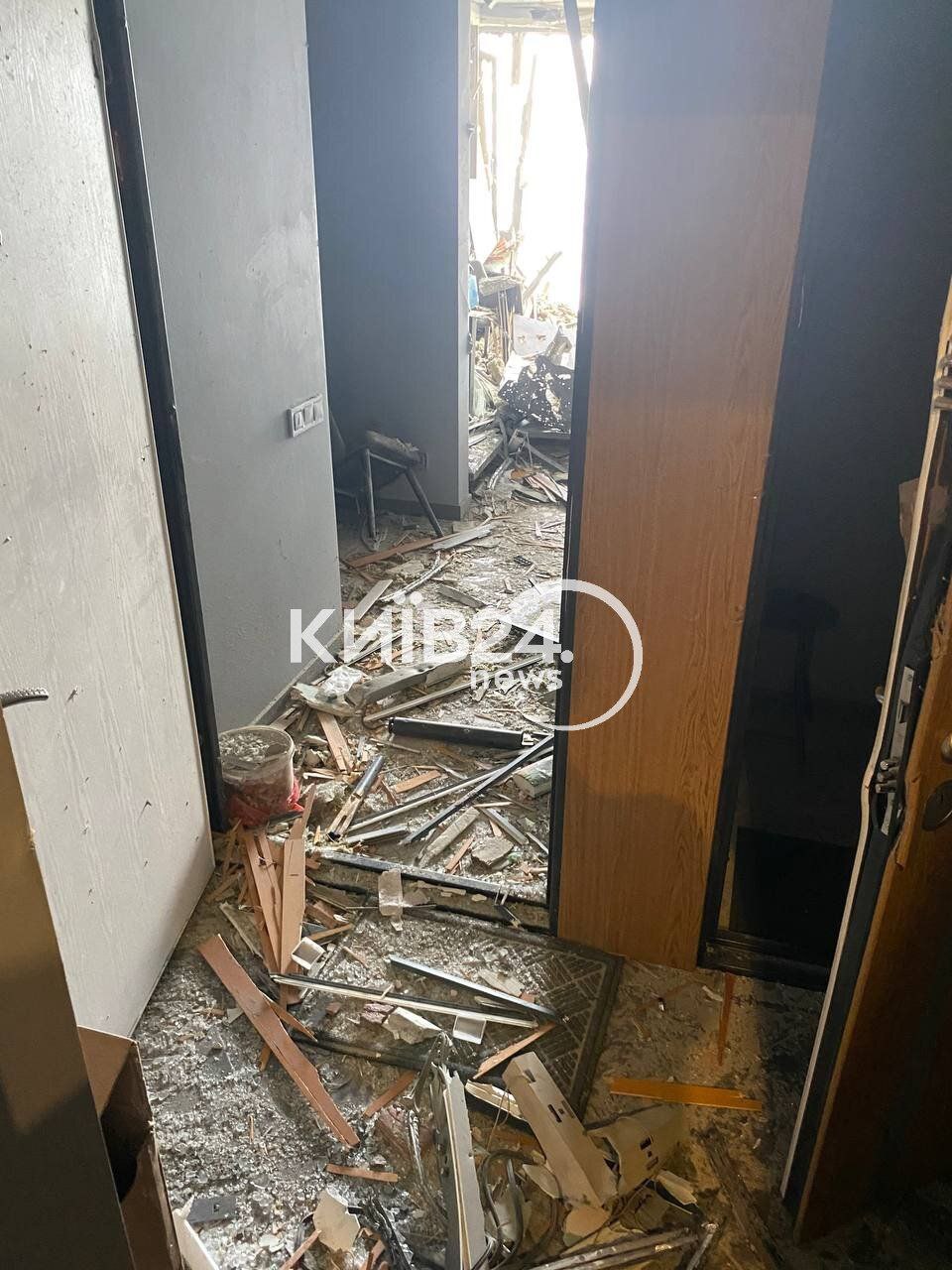 Пошкоджено дві квартири, одну на 25 поверсі, там поранення отримав чоловік. Його травмували уламки розбитих вікон. Нині він перебуває у лікарні, йому накладають шви. У коридорі видно краплі крові.
