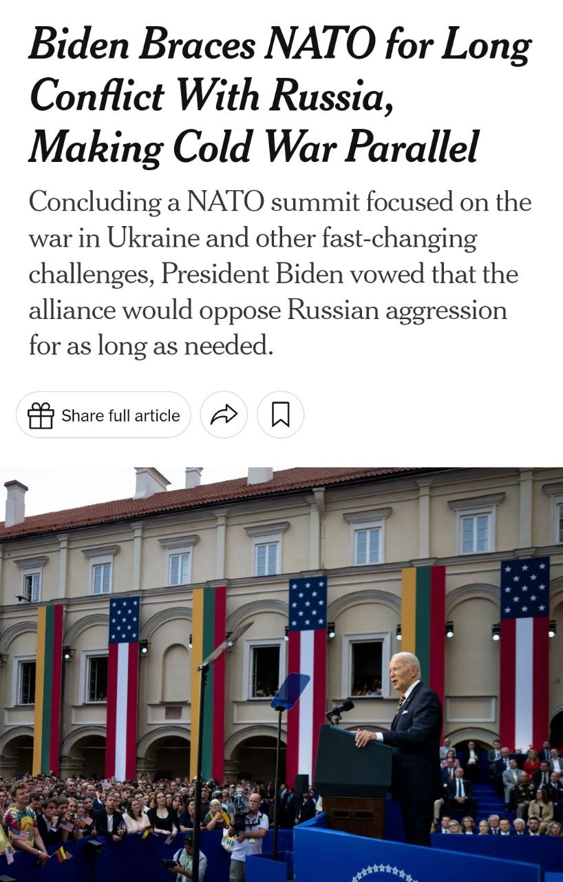 Про це пише New York Times, аналізуючи промову президента США після закінчення саміту Альянсу у Вільнюсі.