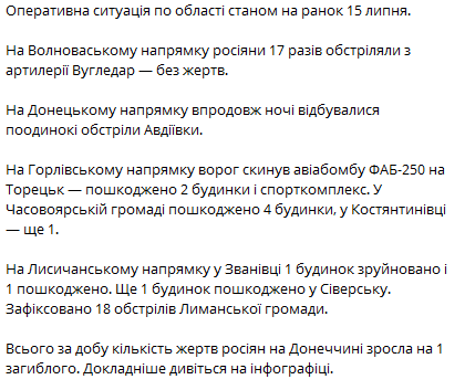 Так, на ранок 15 липня на Волноваському напрямі росіяни 17 разів обстріляли з артилерії Вугледар – обійшлося без жертв. На Донецькому напрямі протягом ночі відбувалися поодинокі обстріли Авдіївки.