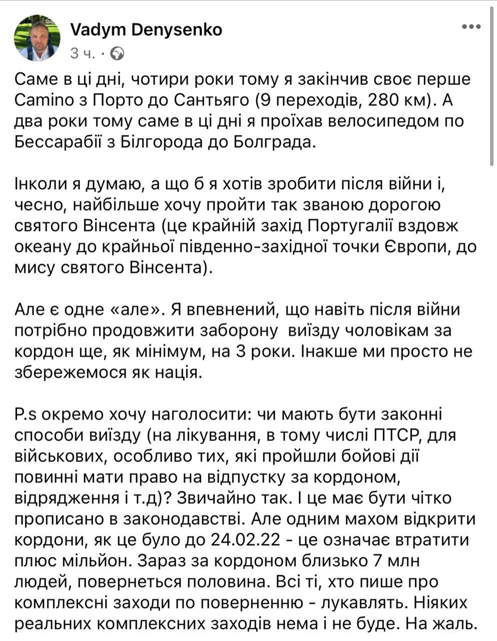 "Іноді я думаю, а щоб я хотів зробити після війни і чесно, найбільше хочу пройти так званою дорогою святого Вінсента. Але є одне "але". Я впевнений, що навіть після війни потрібно продовжити заборону виїзду чоловікам за кордон ще як мінімум на 3 роки Інакше ми просто не збережемося як нація Одним махом відкрити кордони, як це було до 24.02.22 – це означає втратити плюс 1 млн. Зараз за кордоном близько 7 млн. чоловік, повернеться половина Усі ті, хто пише про комплексні заходи щодо повернення – лукавлять. Жодних реальних комплексних заходів немає і не буде. На жаль", - пише Денисенко.