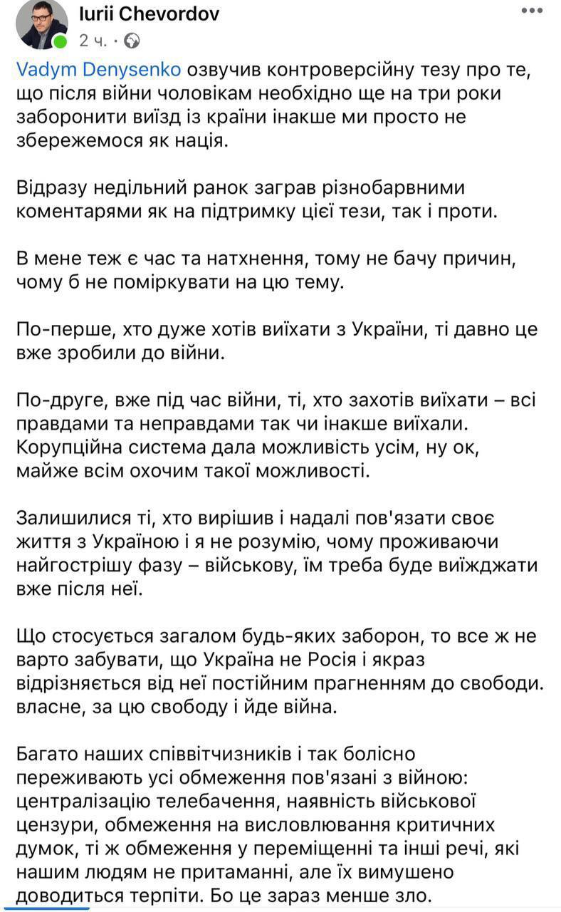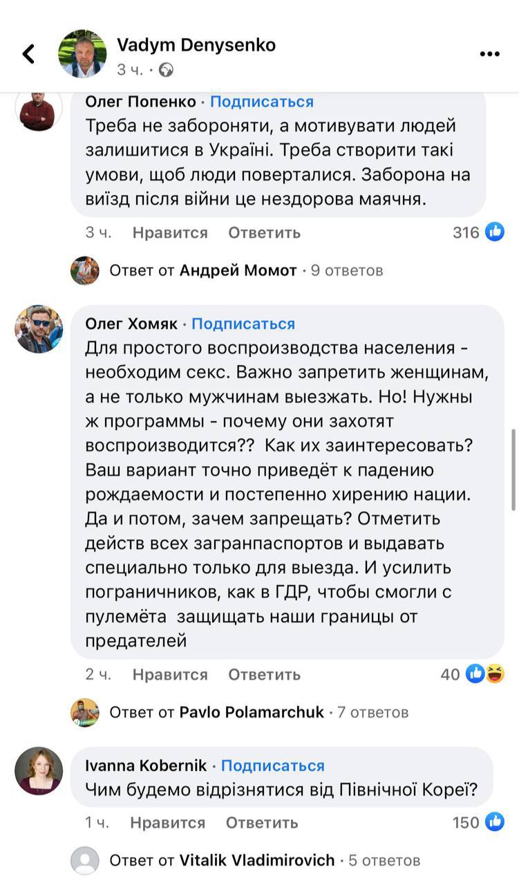Керівник Українського інституту майбутнього Вадим Денисенко у себе на сторінці у Facebook заявив, що після закінчення війни потрібно як мінімум на три роки заборонити виїжджати чоловікам із країни - "інакше ми просто не збережемося як нація".