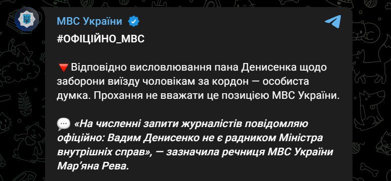 "Висловлення пана Денисенка про заборону виїзду чоловікам за кордон - особиста думка. Прохання не вважати це позицією МВС України", - йдеться у заяві відомства.