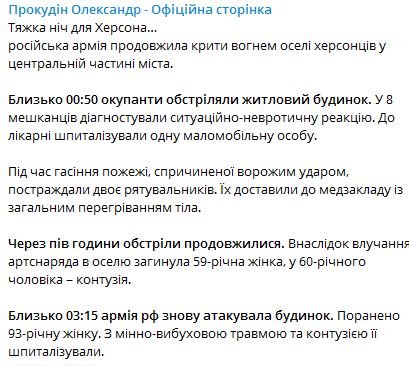 Близько 03:15 армія Росії знову атакувала будинок. Поранено 93-річну жінку. З мінно-вибуховою травмою та контузією її госпіталізували.