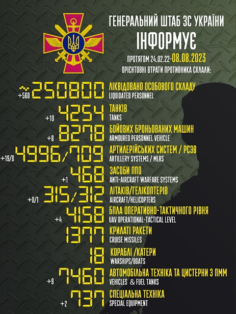 Втрати російських військ продовжують зростати. Станом на 8 серпня за добу знищено 560 окупантів, вертоліт, 10 танків та 12 артсистем.