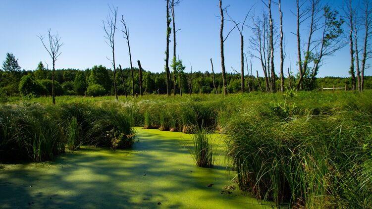 "Десь на водоймах заповідника: тут літо одягається у всі відтінки зеленого - від смарагдового і малахітового до м'ятного і фісташкового. І всі ці кольори переливаються один в одного, змішуються, стелиться по берегах, воді, йдуть до горизонту... де з-під густої і, звичайно, зеленої ряски, сяє темне дзеркало води. Там теж хтось живе. Може, зелена жаба? - сказано у підписі до фото.