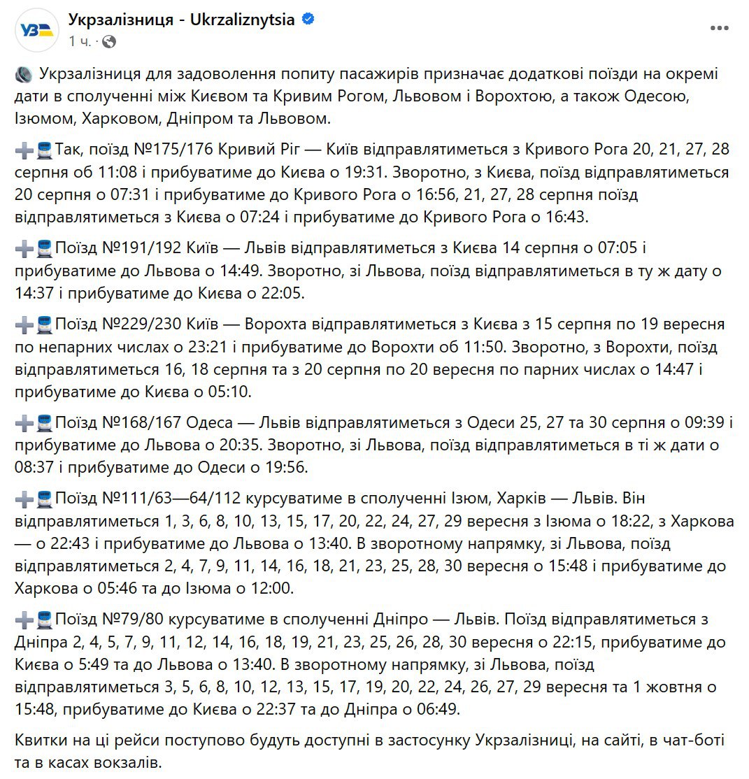 Квитки на ці рейси будуть поступово доступні у додатку Укрзалізниці, на сайті, у чат-боті та в касах вокзалів.