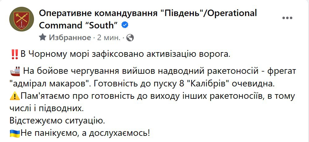 "На бойове чергування вийшов надводний ракетоносій - фрегат "Адмірал Макаров". Готовність до пуску восьми "Калібрів" очевидна", - заявляють військові.