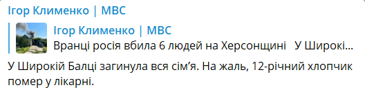 "У Широкій Балці загинула вся родина. На жаль, 12-річний хлопчик помер у лікарні", - написав Клименко.