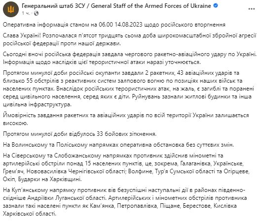 Вранці 14 серпня Генштаб ЗСУ оприлюднив зведення про ситуацію на фронті.