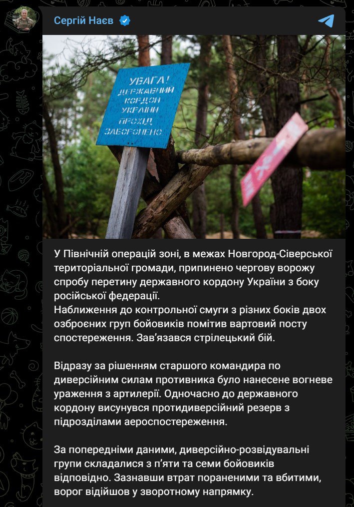 08.17 На Чернігівщині була спроба проникнення російської диверсійної групи, повідомив командувач Об'єднаних сил Сергій Наєв.