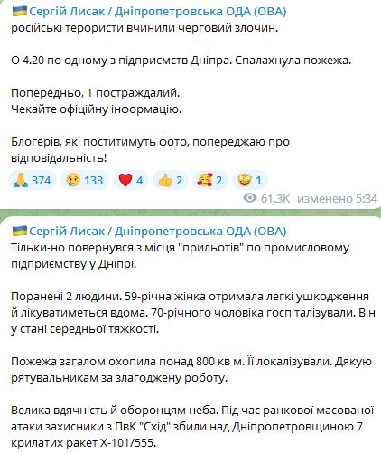07.34 Вночі РФ вдарила по одному із підприємств у Дніпрі.