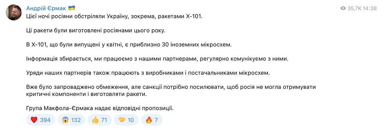 Російські ракети були випущені у квітні та містять близько 30 іноземних мікросхем. Єрмак каже, що напрацьовуються пропозиції, як позбавити Москву доступу до західних технологій і закликає посилити санкції.