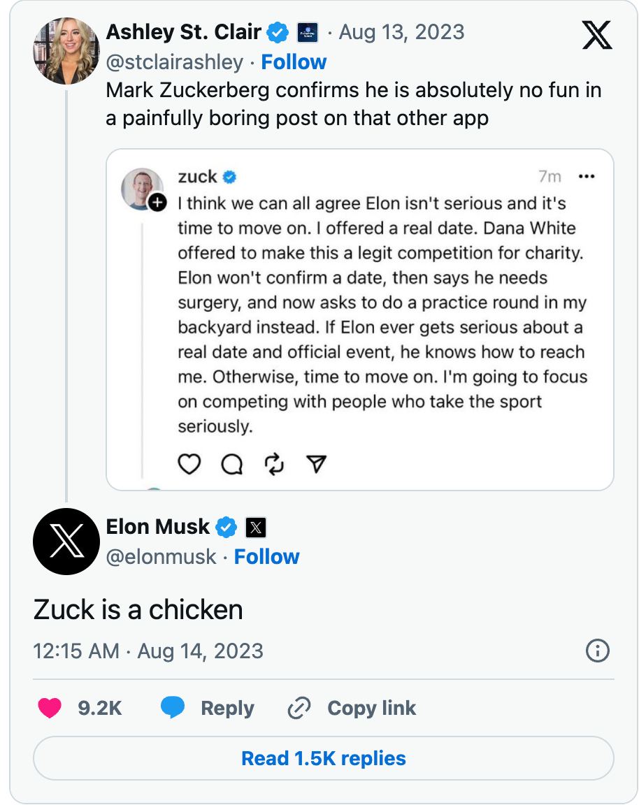 Цукерберг заявив, що Маск несерйозно ставиться до їхнього можливого поєдинку. У відповідь той назвав його куркою