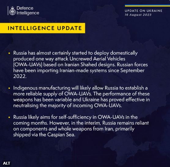 У британській розвідці зазначають, що Росія, ймовірно, прагне самозабезпечення безпілотниками найближчим часом. При цьому вона, як і раніше, залежить від комплектуючих з Ірану, які в основному доставляються через Каспійське море.