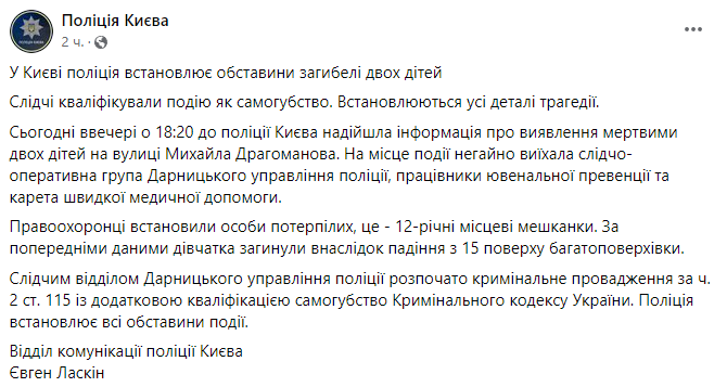 Як повідомляє телеграм-канал Національної поліції України, сьогодні о 18:20 до поліції Києва надійшла інформація про виявлення мертвими двох дітей на вулиці Михайла Драгоманова.