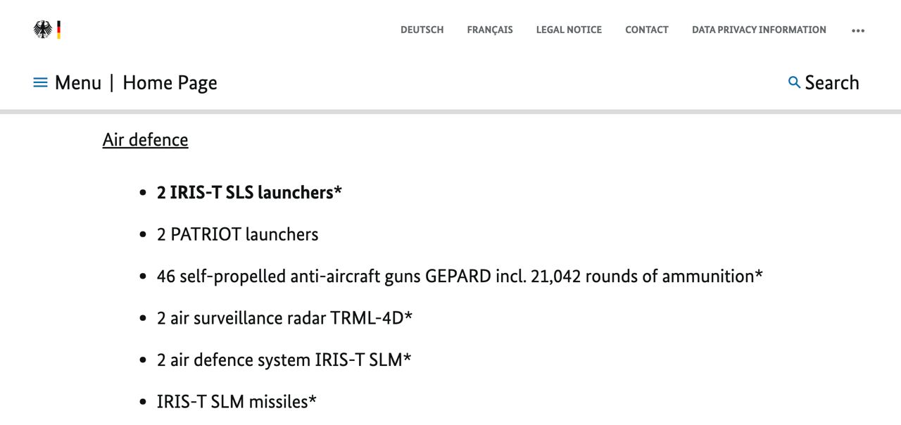 Німеччина передала Україні дві додаткові системи ППО IRIS-T та комплект боєприпасів