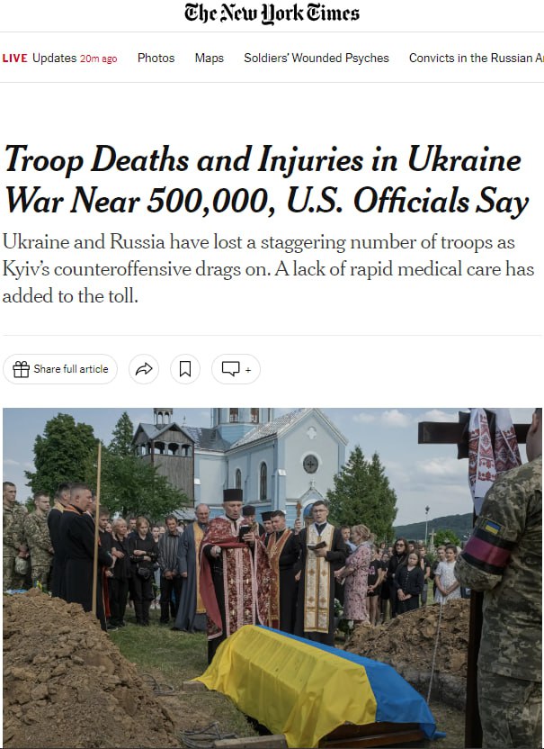 За оцінками США, сумарні втрати Росії та України з початку повномасштабної війни можуть сягати 500 тисяч осіб, при цьому Росія втратила вбитими до 120 тисяч, а Україна – до 70 тисяч солдатів.
