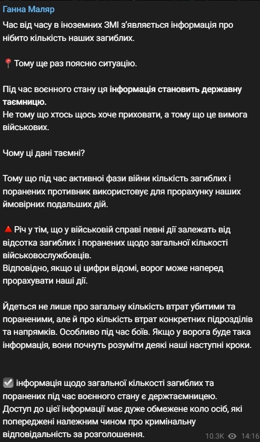 "Ще раз поясню ситуацію. Під час воєнного стану ця інформація становить державну таємницю. Не тому, що хтось хоче приховати, а тому що це вимога військових", - написала Маляр.