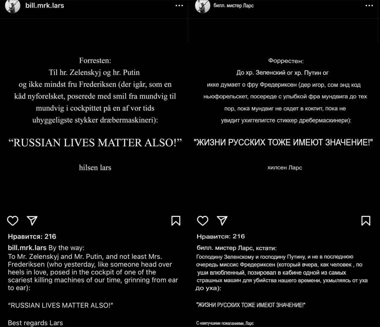 Свою посаду він адресував Володимиру Зеленському та Володимиру Путіну, а також Фредеріксен, "яка вчора, як людина, по вуха закохана, позувала в кабіні однієї з найстрашніших машин нашого часу, посміхаючись від вуха до вуха".