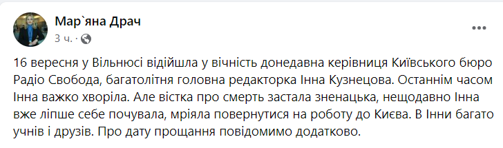 "Останнім часом Інна важко хворіла. Але звістку про смерть застала зненацька, нещодавно Інна вже краще почувалася, мріяла повернутися на роботу до Києва. У Інни багато учнів і друзів. Про дату прощання повідомимо додатково", - написала Драч.