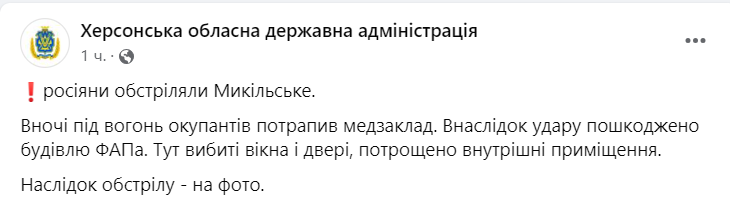 "Вночі під вогонь окупантів потрапила медустанова. Внаслідок удару пошкоджено будівлю ФАПу. Тут вибиті вікна та двері, розбиті внутрішні приміщення", - йдеться у повідомленні.