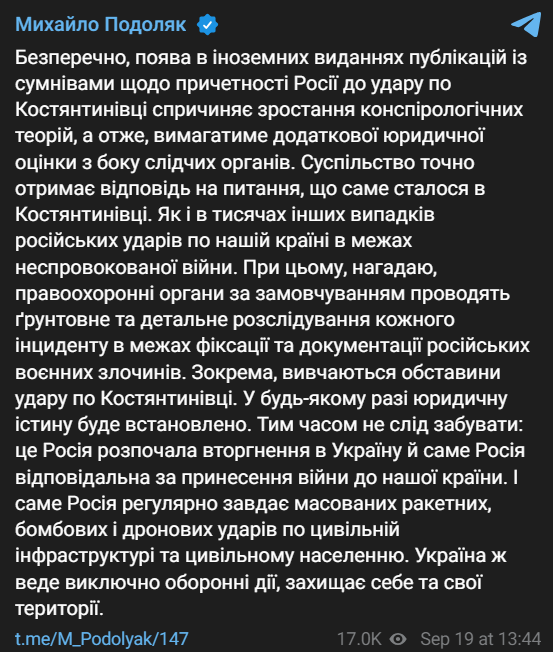 Радник глави Офісу президента Михайло Подоляк прокоментував розслідування The New York Times, де стверджується, що удару по Костянтинівці могла завдати українська ракета.