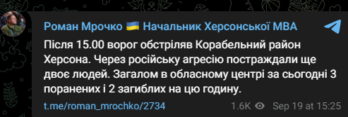 "Після 15:00 ворог обстріляв Корабельний район Херсона. Через російську агресію постраждали ще двоє людей", - зазначив Роман Мрочко.