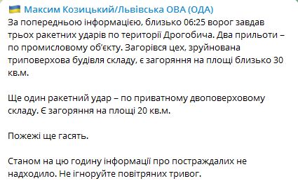 Близько 06:25 було три ракетні удари по території Дрогобича. Два прильоти – по промисловому об'єкту. В результаті спалахнув цех, зруйновано триповерхову будівлю складу, є спалах.