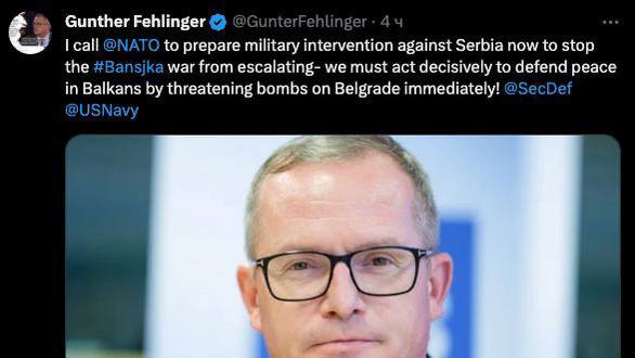 "У Банську розпочалася сербська війна проти Косова. Я закликаю НАТО негайно підготувати інтервенцію проти Сербії. Бомбіте Белград прямо зараз!" - написав голова Європейського комітету з розвитку НАТО Гюнтер Фелінгер у соціальній мережі X (колишній Twitter).