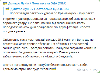 У Кременчуці ракетним ударом 22 вересня було пошкоджено близько 150 будівель.