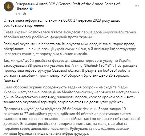 Вранці 27 вересня Генштаб ЗСУ оприлюднив зведення про ситуацію на фронті.