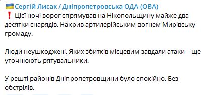 В решті районів Дніпропетровської області вночі було спокійно. Пройшло без обстрілу.