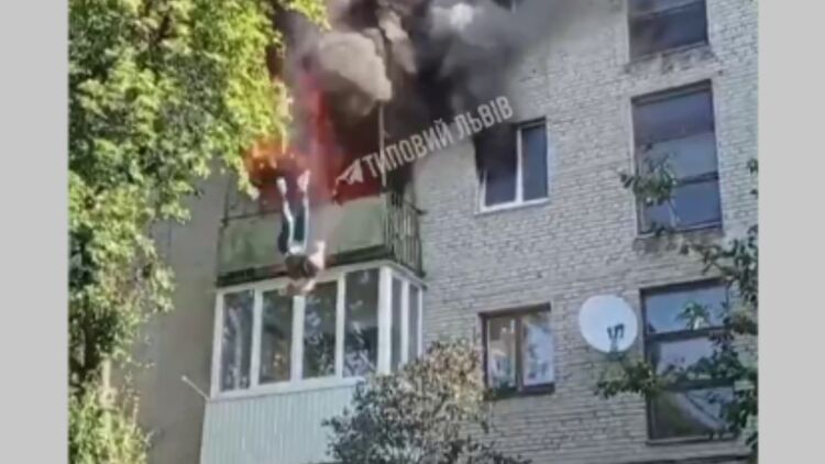 Чоловік вирішив врятуватися з вогню стрибком із верхнього поверху. Скріншот відео